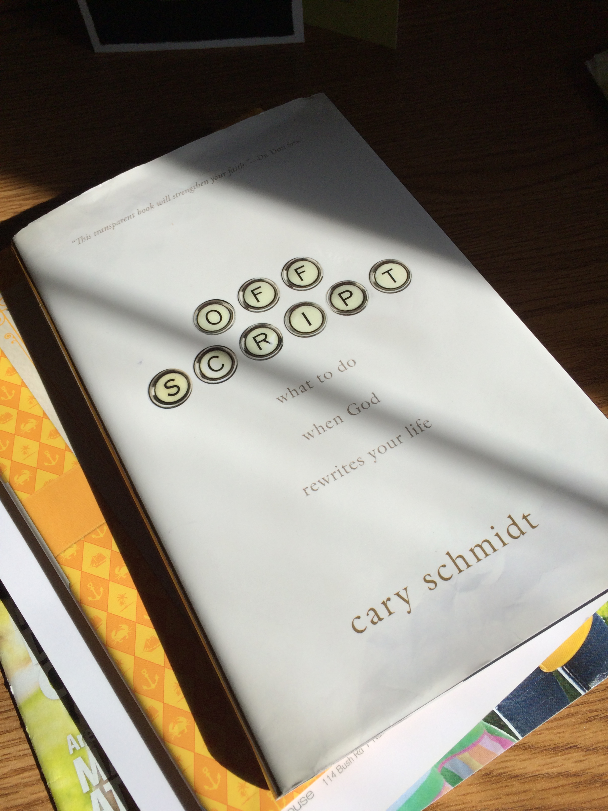 So, I have to admit, I was angry with this book at first. I felt bitterness bubbling just below the surface. My life is definitely “off script”—it doesn’t feel as though anything will ever be “normal” again. But Cary Schmidt was in his forties when his own life took a turn and he was diagnosed with cancer. He was married and already had children. My son may never get to graduate high school, I thought. Then came Schmidt’s follow-up testing, which revealed that his prognosis was good. More than likely, he would live. That’s great for him, but our follow-up testing didn’t produce such promising results. I contemplated whether I would finish the book and if I did, whether I would just be angrier when I came to the last page. It was difficult for me to hear his light-hearted approach at first. Like The Young Traveler’s Gift, he listed steps to deal with life circumstances to produce the best results—a deeper relationship with Christ and ultimately, God’s glory. The first step was “Love God, Trust God, Live for God.” I thought this must be eas[ier] for him when the outlook isn’t so bleak, but what about me? Could I have the attitude he talks about in chapter two—“Be of Good Cheer?”